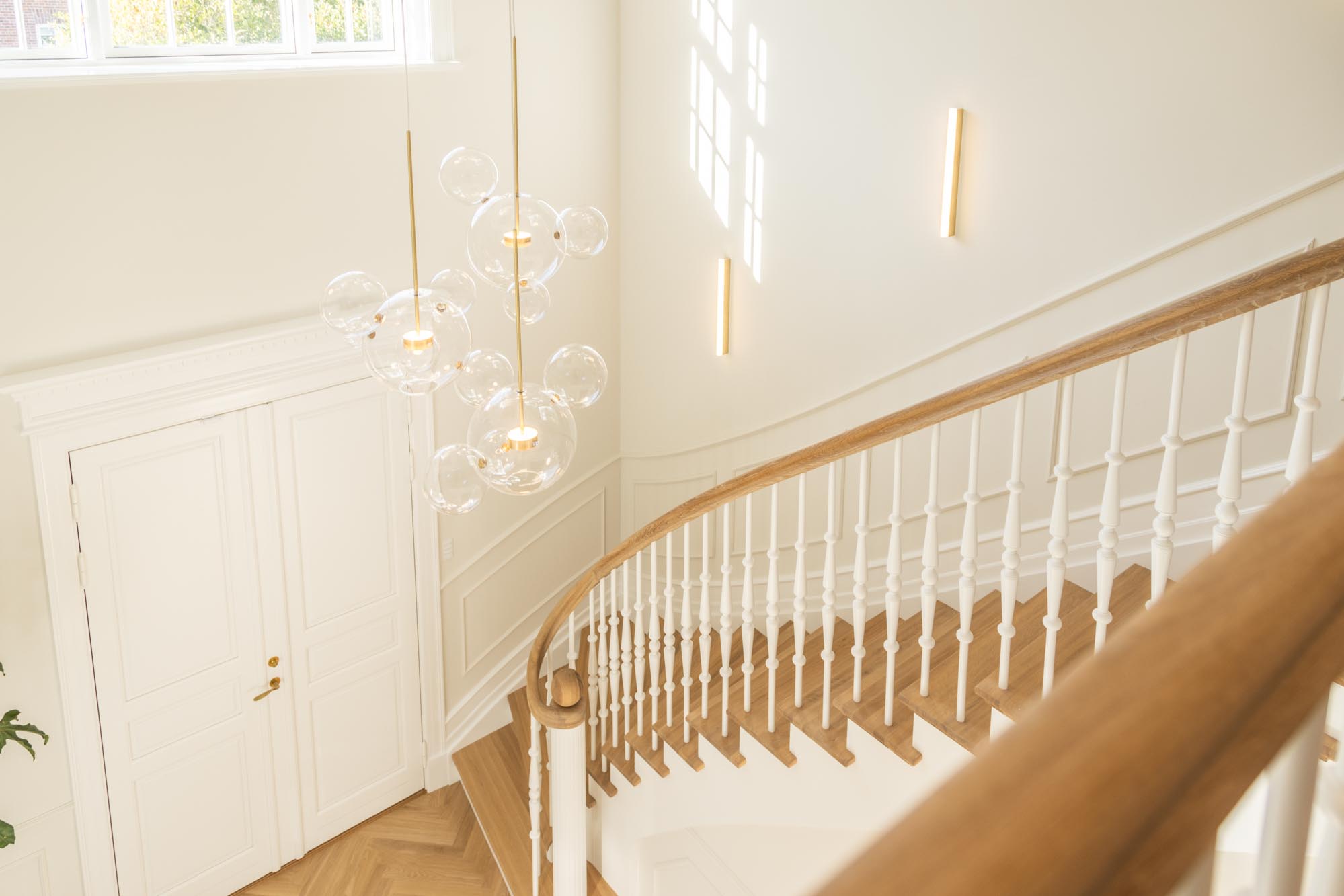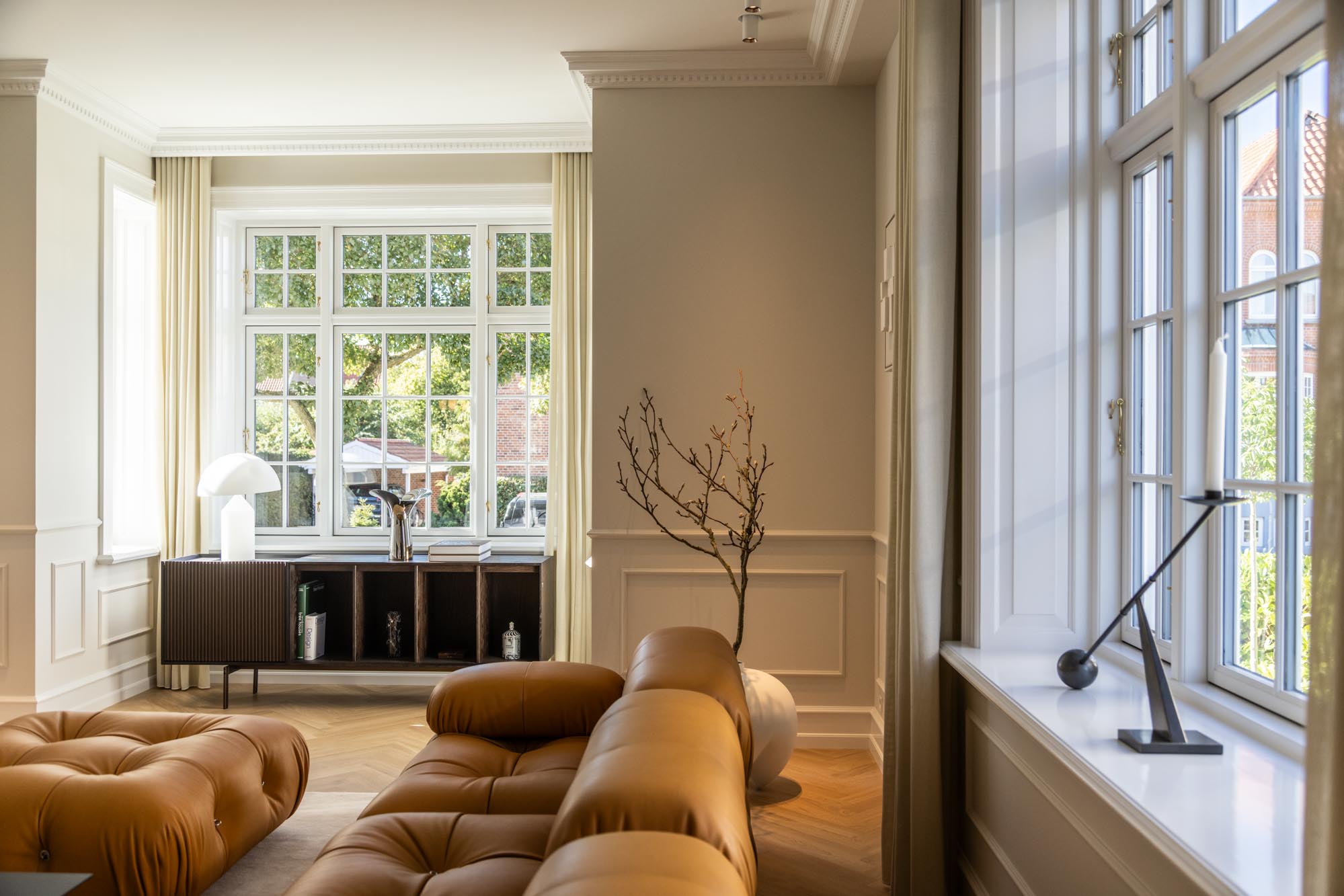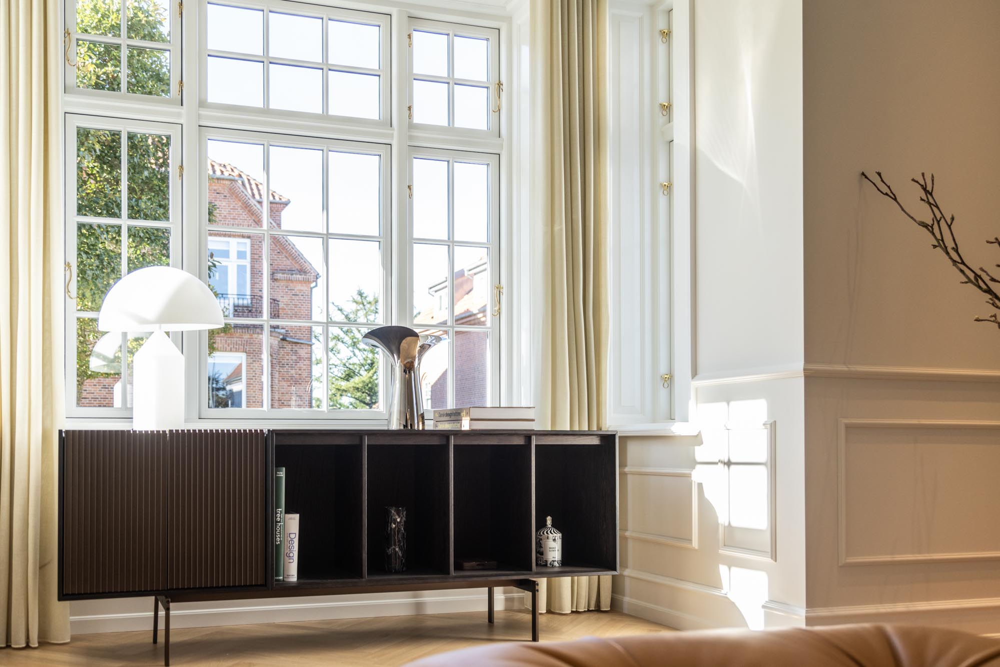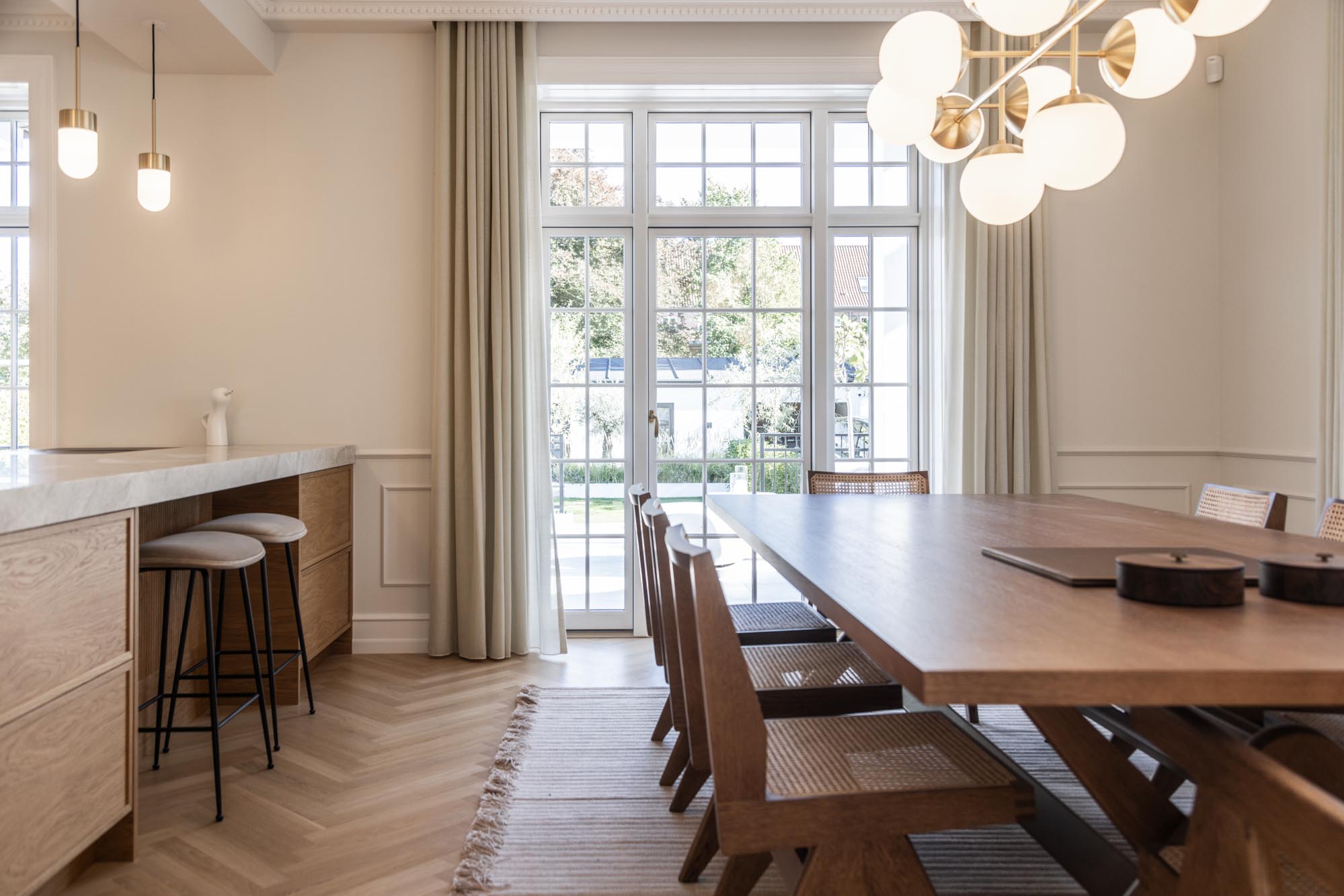 Det gennemgående tema er egetræ og lyse farver – en kombination, der både fremhæver husets klassiske detaljer og giver plads til moderne funktionalitet. Egetræet tilfører varme og struktur, mens de lyse flader åbner rummene og lader lyset danse gennem huset. Sammen skaber de en rolig og nordisk atmosfære.
