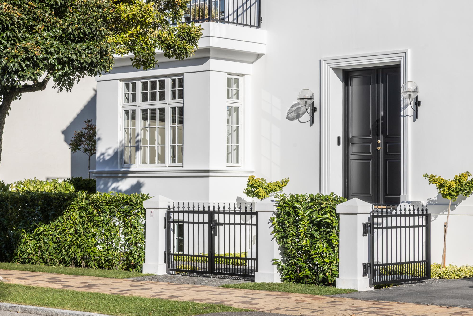 Som kontrast er den klassiske og elegante hoveddør er valgt i farven sort på udvendig side.