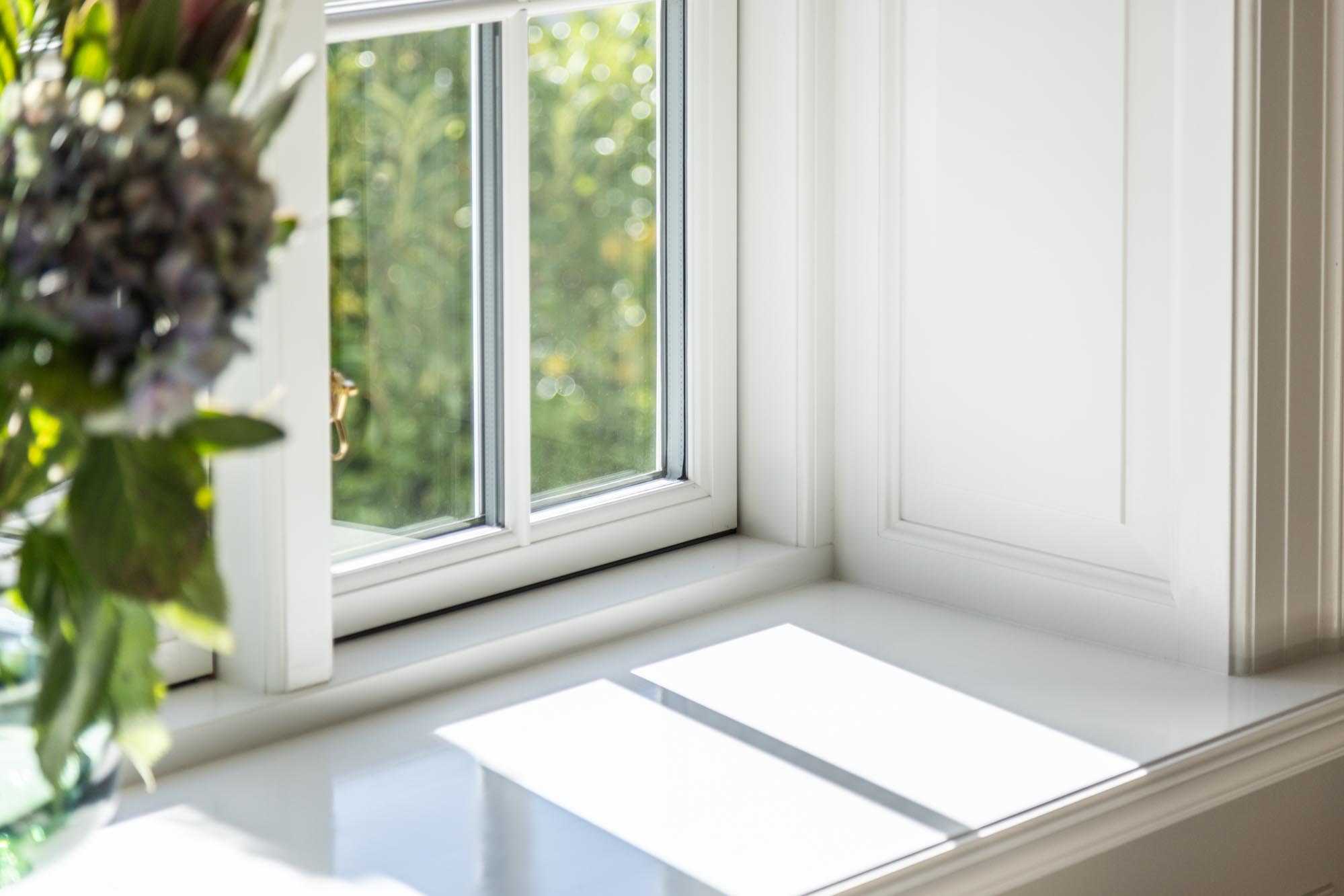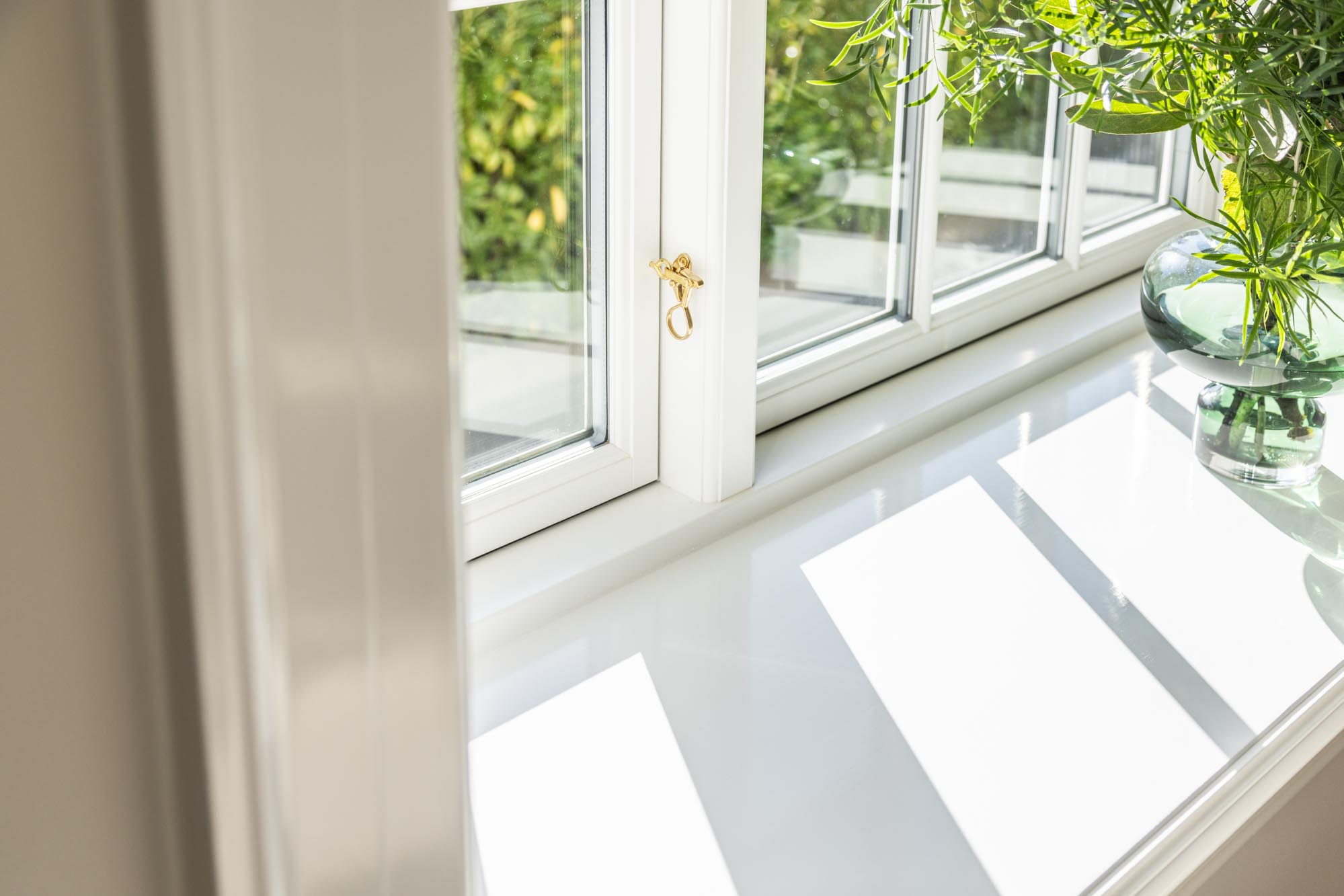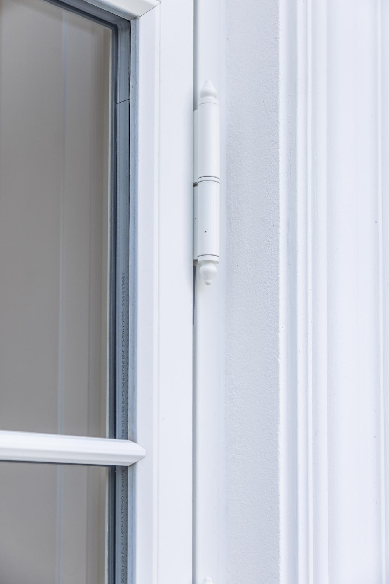 For at fuldende udtrykket er der valgt vinduer og døre med 2‑lags glas i nuancen NCS S 0500‑N antikhvid, som understreger det lyse og tidløse formsprog. De slanke 20 mm sprosser giver et let og elegant udtryk – og et fantastisk lysindfald. Hele looket i villaen er toppet op med messing stormkroge & anverfere – og hvide hængsler med pynteknop – og ikke mindst den dekorative hulkehl på de vandrette poster.