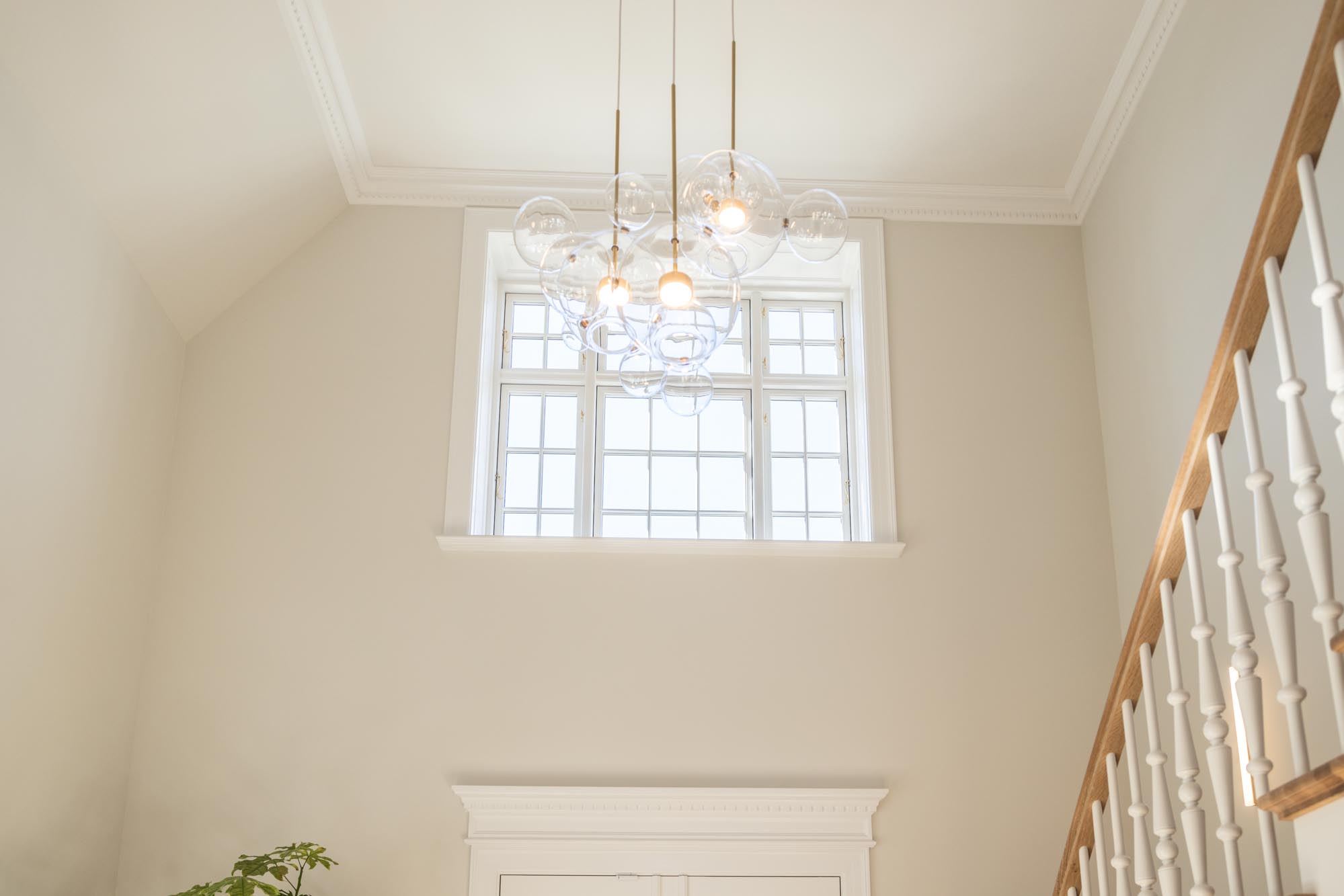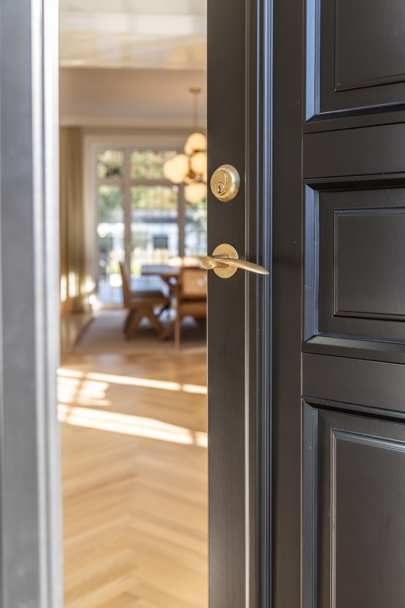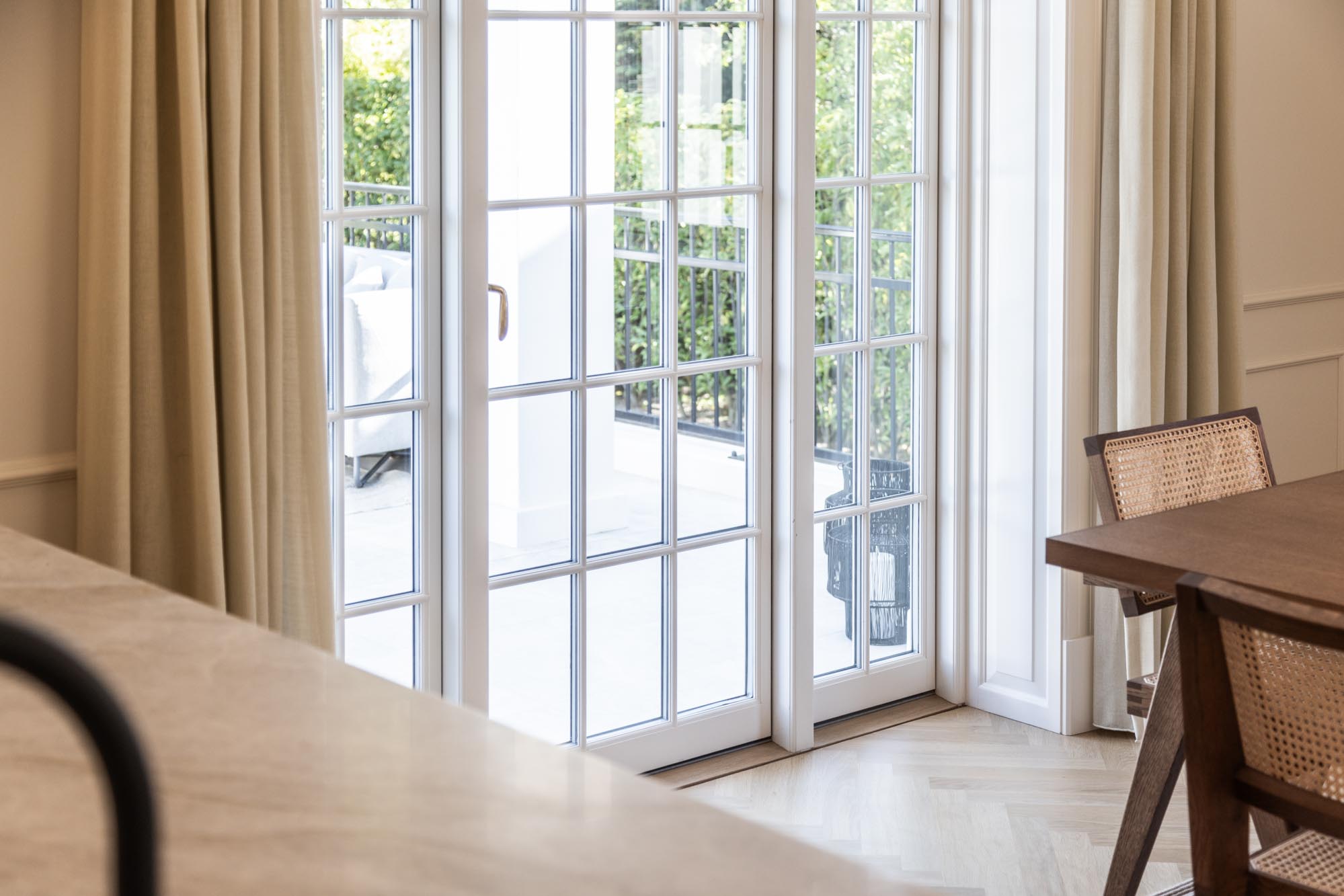For at fuldende udtrykket er der valgt vinduer og døre med 2‑lags glas i nuancen NCS S 0500‑N antikhvid, som understreger det lyse og tidløse formsprog. De slanke 20 mm sprosser giver et let og elegant udtryk – og et fantastisk lysindfald. Hele looket i villaen er toppet op med messing stormkroge & anverfere – og hvide hængsler med pynteknop – og ikke mindst den dekorative hulkehl på de vandrette poster.